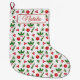 Personalise this perfectly holiday stocking with your own name! Great gift for someone you love. This stocking features a simple red and green holiday motifs design design with all the favourites of the Christmas Season! Reds and green Christmas trees, ornaments and holly on a white background. Change the Name, Font, and Text Colour to your liking. Grab one for your mantel or gift this Artistic Holiday Home Decor! Great for all genders!