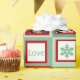 Add four medium-large personalised custom digital photos to this festive classy square jumbled frame shape picture frame wrapping paper that says "love and joy" with light and dark shades of grey, red and green.