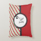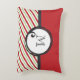 A pillow with the bottom half covered in a red green and white diagonal striped christmas pattern. Reminsicent of peppermint flavoued Christmas candy canes. The top half is a festive Christmas red. In the centre is a cute circle in a handdrawin style with a monogram in the centre.