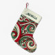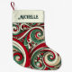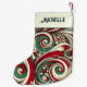 This personalized name Christmas stocking has a fun red and green swirl pattern with circle accents.