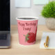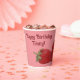 Add a sweet touch to any party with personalised paper cups. These cups feature illustrations of ripe red strawberries set against a pink background. Your custom text appears in bold, dark red lettering.