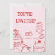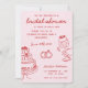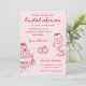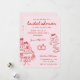 Red and pink bridal shower invitation featuring champagne, cake, and rings!