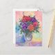 traditional floral watercolor artwork featuring red and purple roses blossoms in a vase with colourful a colourful background on a postcard.