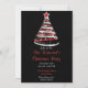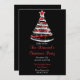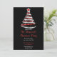 A red and silver christmas tree on a black background. The back of the invite is black with snow pattern