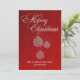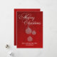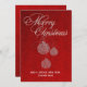 Elegant flat style corporate Christmas greeting card done in a red on red damask design. Silver tone graphics of Christmas tree ball ornaments, hang down from silver graphic text reading Merry Christmas.