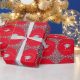 This modern design features a graduation hat and confetti in silver on a background of red with white text.