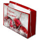 Elegant Christmas and New Year red and silver gift bag with beautiful glittery Christmas baubles, white sparkling lights, shiny pearls, tinsel and a space for your text.