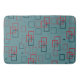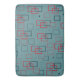 Interlocking squares in red and black create a geometric pattern against a muted teal background. Smaller scattered rectangles and varied line segments add visual interest to the design.