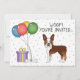 Cute birthday theme design featuring Destei's original cartoon illustration of a cute red and white coat colour Boston Terrier breed dog. Next to the dog there are colourful birthday balloons tied on a dog bone and a purple and yellow colour present box. The background has a playful pattern of colourful pastel confetti on a white background. Personalise the sample text areas with the details of your event.