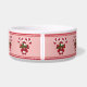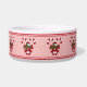 Destei's original illustration of two red and white striped Christmas candy cane treats decorated with a red bow and a Christmas holly / Common holly plant. The design is placed a few times going around the bowl. There is also a personalizable text area for a name or other custom text. The design is framed by red colour border on the top and bottom and the background colour is pink. This festive design with classic red and green Christmas colour scheme is ideal for the Holiday season when decorating with the traditional colour palette. The design also works great for pets named "Candy cane" or "Peppermint", for example.