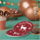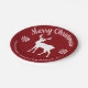 Festive design in classic red and white colors featuring Destei's standing deer silhouette together with snowflakes and two personalizable text areas. The top text reads "Merry Christmas" and on the bottom there is space for a family name or other custom text.