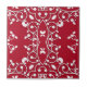 This ceramic tile features a rich, deep red background that serves as a striking contrast to the ornate white pattern adorning it. The central motif of the design is a symmetrical, elongated diamond shape, which could also be interpreted as a stylised representation of a flower or leaf. This central figure is surrounded by swirling vine-like patterns with leaf motifs, adding a sense of movement and sophistication to the overall design. The corners of the tile are not left bare but are adorned with additional decorative elements, contributing to the tile’s intricate aesthetic. The stark colour contrast between the white pattern and the red background highlights each detail, making the complexity and craftsmanship of the design stand out.