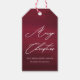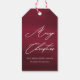 Beautiful and festive maroon red Merry Christmas gift tag with elegant white calligraphy script.