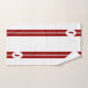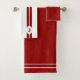 Make a bold statement with rich textured red and white. Your initial displays in red over a white matting and red vertical stripes on both ends of the hand towel. The bath towel has double white horizontal stripes at each end over a red background and the wash cloth is solid red. Artwork and design by Karlajkitty