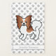 Destei's original cartoon illustration of a red and white coat colour Papillon breed dog. There is also a personalizable text area for a name or title. The background has a pattern of dog paw prints.