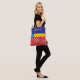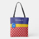 Bright red and white polka dots on the bottom, a solid blue color block at the top, and yellow band with a bright blue button separating them, to create an ultra cute tote bag. Very modern, bold and graphic, while retaining a retro, country look. Very cute for the office or school, darling for the Saturday market or the beach!