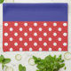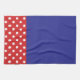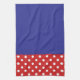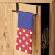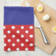 So cute and fun! This kitchen towel features a border of bright red and white polka dots against a navy blue background.