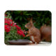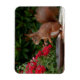 A beautiful snapshot of nature and its wonderful furry creatures. Featuring a red squirrel posing near some small red flowers.