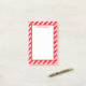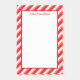 Custom stickies with red script letters on a diagonal pattern of red and white stripes.