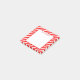 Custom square stickies with red script letters on a diagonal pattern of red and white stripes.
