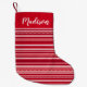 Add a festive touch to your holiday mantle this Christmas with cute, personalised Christmas stockings. The Christmas stockings feature your name at the top in a white script font with a red background. The design features a red, burgundy, and white sweater knit pattern. The simple, elegant Christmas stocking is sure to impress your holiday guests.