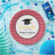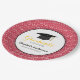 This graduation paper (disposable) plate features a graphic of a graduation hat (mortarboard) and customisable text for: Class of, Graduates Name, Name of School. This paper plate is accented with a white swirl pattern on a red background. The word "graduate" is yellow.