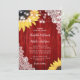 Rustic red wedding invitation featuring sunflowers against a barn wood background adorned with white floral lace and string lights. Perfect card design for inviting your guests to your red rustic country, backyard or barn wedding party inspired by sunflower flowers.