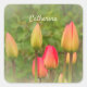 The fresh spring tulips in this photo are just getting ready to bloom, but they're already beautiful. The petals show beautiful transitions from green to yellow to the vivid red tones they will have when they open. Some of the flowers are almost red, while others are just starting to change colour. Behind the tulips are the green leaves of another garden plant. This springtime floral photo has the corners lightened a bit for a soft and misty look. Bring these flowers home to your things and projects--just replace the sample name with your own name, or with the name of someone special who would love these tulips. This springtime floral photo also looks great on round stickers. Enjoy choosing the best style to bring this beauty to your gifts or projects.