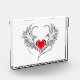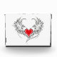 Artistically painted red heart with angel wings grey, decorated with black smooth contour.