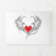 Artistically painted red heart with angel wings grey, decorated with black smooth contour.