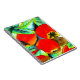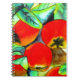 with original art design from watercolour painting of juicy, red apples hanging on trees at the orchard. Bright red and yellow colourful fruit design juxtaposed against the lime green coloured leaves.