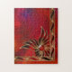 An abstract work in fiery red and gold. A clear red gem is surrounded by gold-edged flames accented with sparkling rubies and yellow starbursts. The swirling, spiralling fractals in the background appear in deeper colours inside the gold filigree of the flame motif.