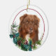On the front of this Holiday ornament is a portrait of a beautiful red Australian Shepherd Dog peeking out of a holly and evergreen bough. Red berries and pine cones decorate the holly and pine sprigs. The image is placed on a white circle within a thin red line circle. The back of the ornament has the same evergreen bough wreath and circle with your custom text in red.