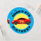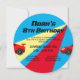 Red auto race car kid's Birthday party invitations. Round automotive theme party invites for children's Birthday, BBQ, racing car driving event etc. Personalised text and background colours. Cute racecar drawing with custom name and age of child. Dynamic typography template. Personalise for sporty boy or girl. Funny circle cut out shape. Kid's toys illustration. Make circular invites for 4th 5th 6th 7th 8 th 9th 10th 11th 12th 13th Bday etc. Also nice for children of mechanic or driver.