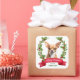 On these Holiday envelope sealer stickers, a watercolor portrait of an adorable brown and white Chihuahua dog is surrounded by a red berry holly wreath. At the bottom is a red banner with your custom Christmas greeting, and your signature is in green beneath it.