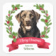 On these Holiday correspondence or package stickers, a beautiful portrait of a Chocolate Labrador Retriever is surrounded by a red berry holly wreath. At the bottom is a banner with your custom Christmas greeting, and your signature is in green beneath it.