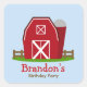 A birthday party sticker featuring an illustration of a red barn with silo and brown fence. Personalise the red and brown text.