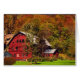 The brilliance of a sunny autumn day is celebrated on this beautiful fine art photography note card. Here is a crimson barn in a valley at the bottom of a hill which is covered with lovely fall foliage colours of red, orange, yellow, gold and green. The photograph has been enhanced to create an impressionistic, artistic effect.