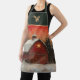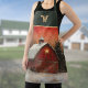 This stunning farmhouse style apron features a red barn with a golden star on it at night, with stars twinkling in a reddish sky. Green trees, with snow on their boughs, frame the sky, and snow is covering the ground. Your or your recipient's initial appears in gold against a colorblock of deep emerald green. The apron's straps ae a matching dark green. This would make a great gift for Christmas or any time of the year.