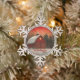 This stunning snowflake shaped Christmas ornament features a red barn with a golden star on it at night, with stars twinkling in a reddish sky. Green trees, with snow on their boughs, frame the sky, and snow is covering the ground. Your or your recipient's name appears in deep red.