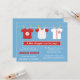 Celebrate with mummy to be who is expecting a little slugger with a baseball themed baby shower party! Great if parents are baseball fans! This modern and classy baseball baby shower invitation has three cute baseball theme baby outfits hanging on a clothesline. A colour palette of red and white over a blue background. Personalise easily with party details.
