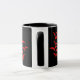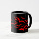 This black and white ringer mug features a collection of simple images of bats flying together in a cloud pattern. The bats are red and the background is black. Kids are sure to love this cute design.