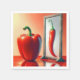 A ripe red bell pepper is shown in front of a mirror, which reflects an elongated hot chilli pepper.