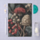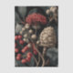 An exquisite and detailed vintage-style botanical illustration featuring a diverse arrangement of flora against a stark black background. The composition includes clusters of vibrant red berries, a burst of small red flowers at the center, and several varieties of large, textured tan seed pods and berries. The leaves are rendered in moody, dark teal and grey tones with fine line work, characteristic of classical natural history engravings.