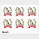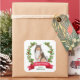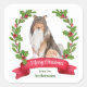 On these Holiday correspondence stickers, a watercolor portrait of a Collie Dog is surrounded by a red berry holly wreath. At the bottom is a red banner with your custom Christmas greeting, and your signature is in green beneath it.