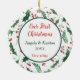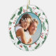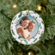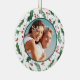 On this pretty "First Christmas" theme ornament, your own photograph is placed within a green holly leaf and red berry pattern circular frame. The back of the ornament has the same background and circle with your custom text in matching red and green. There are four text fields, so you can make it say whatever you'd like.
