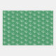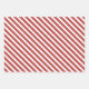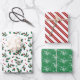 Red, green, and white Christmas wrapping paper sheets with patterns in matching colours: one with green twigs full of red berries. One with red and white peppermint stripes. And one in green with white line art of berry twigs.