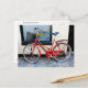A red bicycle leans against a wall near a bar in Copenhagen, Denmark.