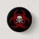 Biohazard symbol skull and crossbones button pin in black, white and red.