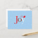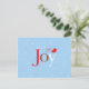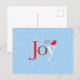 A holiday postcard with a whimsical original design by Mango Moon Studio, brings the spirit of the holidays to life, showcasing a delightful red bird perched atop the word - Joy - against a serene light blue backdrop adorned with gently falling snowflakes.